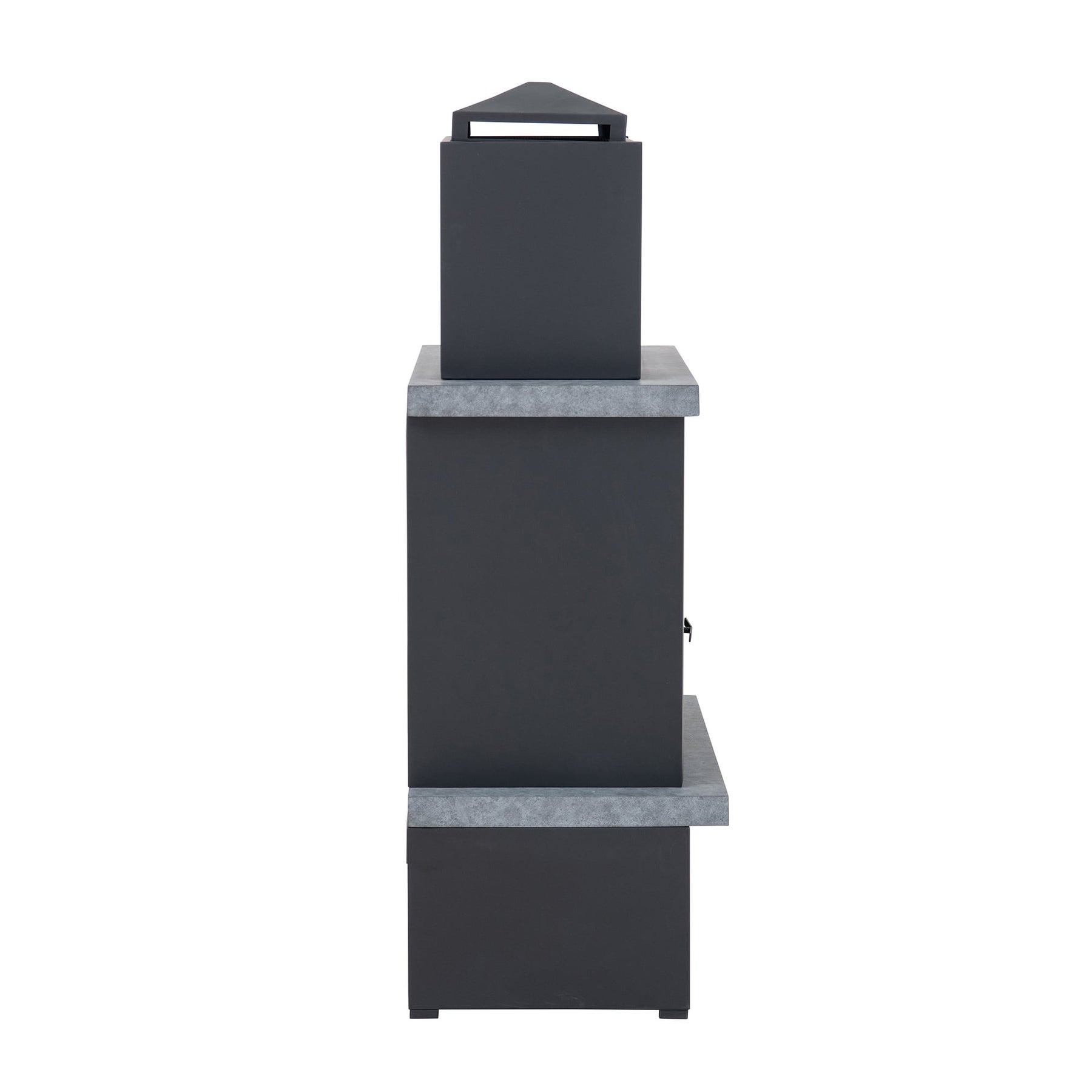 An outdoor fireplace that blends architecture with ambiance: Sunjoy VULTURE features powder‑coated matte‑black steel, a tall chimney that vents smoke upward, and two latched mesh doors for spark protection with an unobstructed fire view.