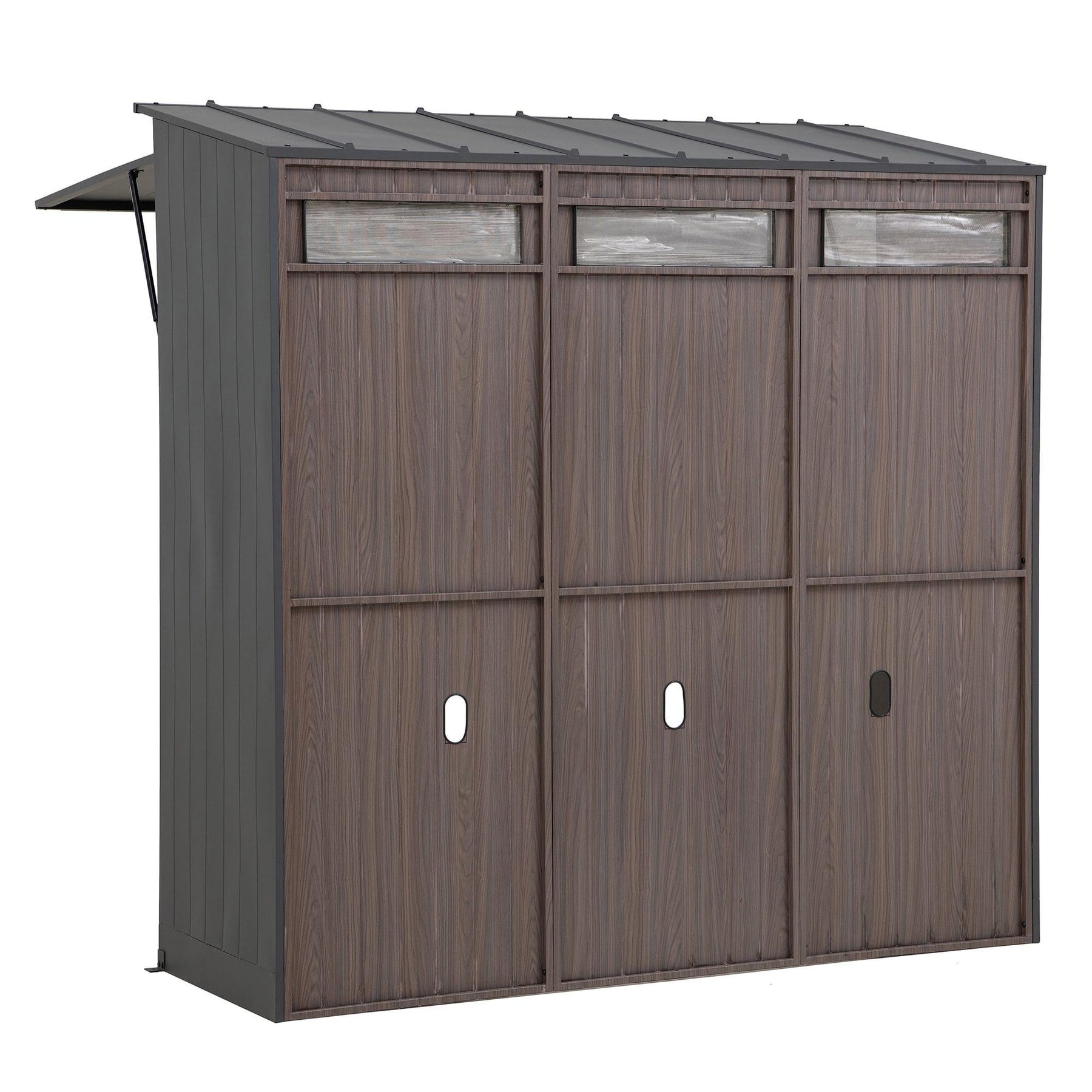 Powder‑coated steel with a realistic wood‑grain finish blends natural appeal with weather resistance. Inside, ventilation mesh panels keep air moving and a built‑in spice rack keeps essentials close. Anchor‑ready foot plates and included ground stakes add stability on soft ground.