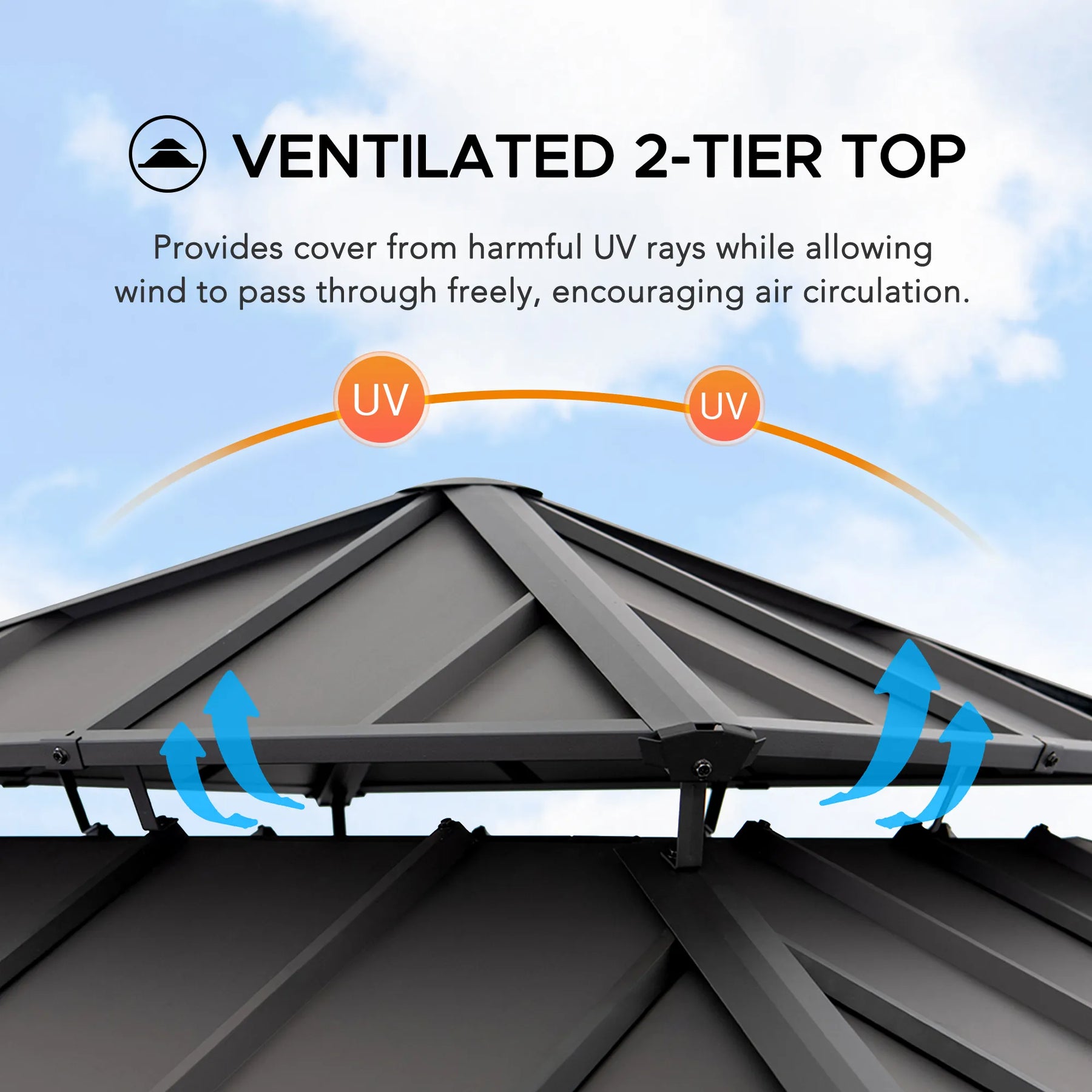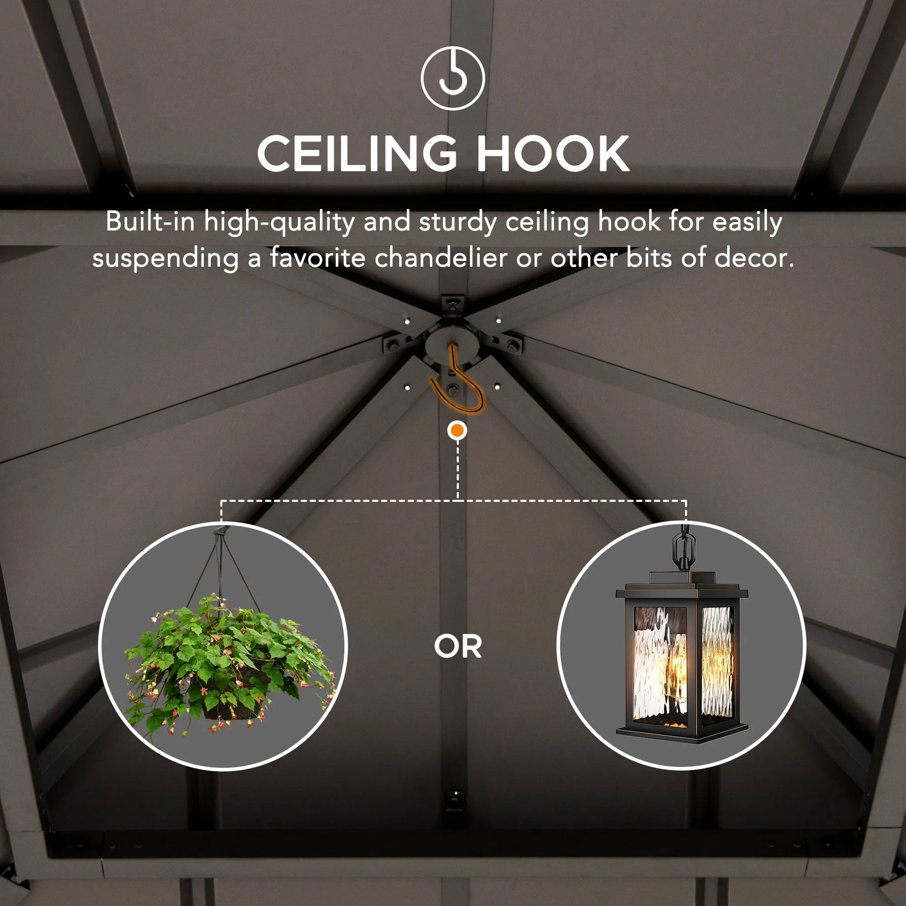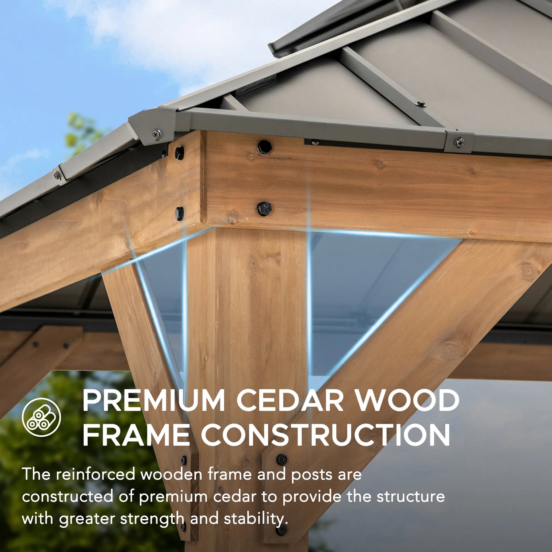Expand your living space by bringing the indoors outside and creating your end-of-the-day oasis that’s the perfect spot for entertaining family and friends. This 330 cm x 330 cm wooden gazebo by the world’s leading ready-to-assemble outdoor structure maker, Sunjoy, creates the perfect outdoor setting for any time of the year. Spend all four seasons enjoying a covered spot outdoors under the chestnut-color cedar wood frame with a anthracite sturdy powder-coated steel roof top that will stand the test of time. The 2-tier roof provides just the right amount of airflow while keeping occasional inclement weather at bay. Set the mood by suspending a chandelier from the incorporated ceiling hook for functional light and high design. With straight-forward, easy-to-follow assembly instructions you’ll be relaxing with your beverage of choice in your favorite new outdoor living space for years to come.