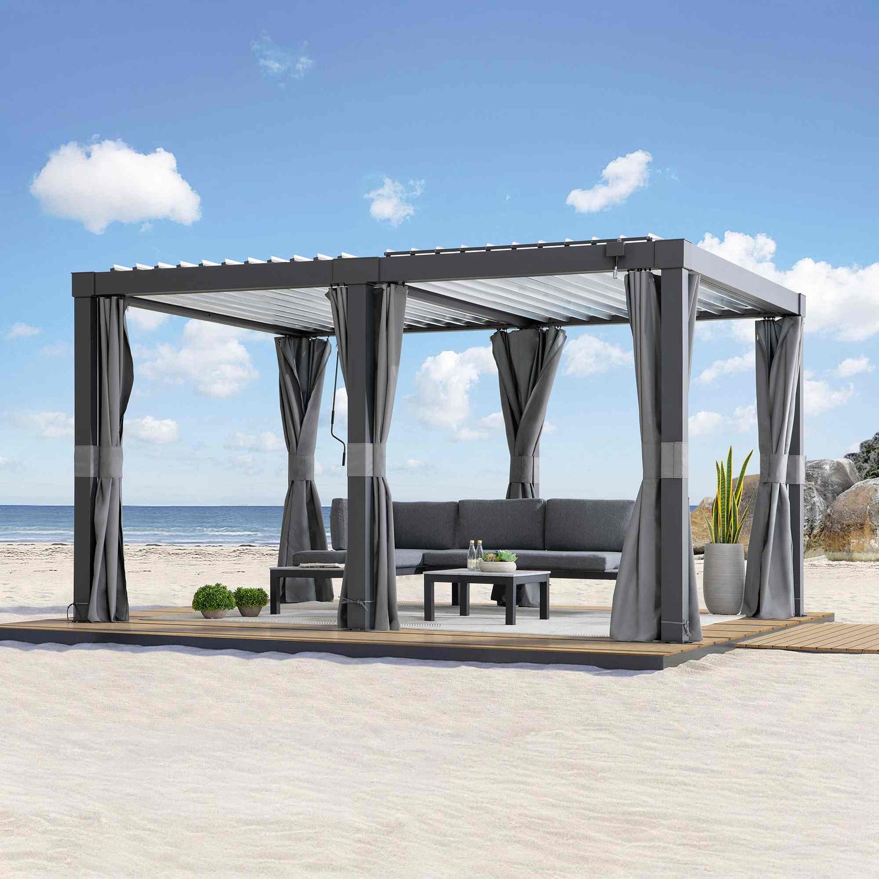 Die Doppel-Laufschiene nimmt Privacy-Vorhänge und Moskitonetze auf, wenn abends Geborgenheit und Windschutz gefragt sind.