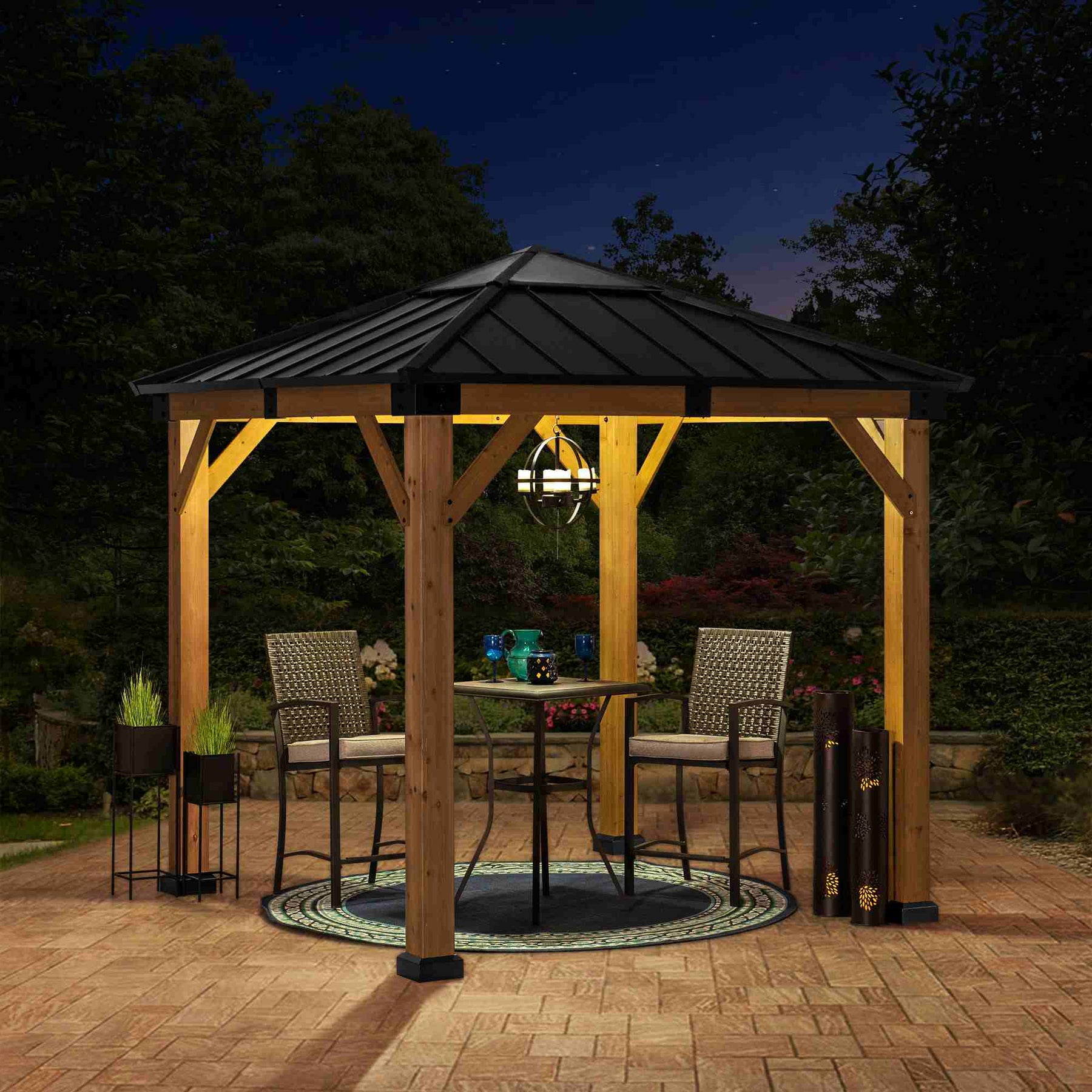 Beide Pavillons werden vorgeschnitten und vorgebohrt mit klarer Anleitung geliefert. Planen Sie einen ebenen Untergrund aus Pflastersteinen, Beton oder Terrassenblöcken ein; beachten Sie die örtlichen Vorschriften zu offenem Feuer und Windwarnungen; und planen Sie eine saisonale Reinigung ein, damit Zedernholz und Pulverbeschichtung wie neu aussehen. Von der Pasta am Schulabend bis zum Advents-Aperitif tritt die Struktur in den Hintergrund – Licht, Luft und Gespräche bleiben im Vordergrund.
