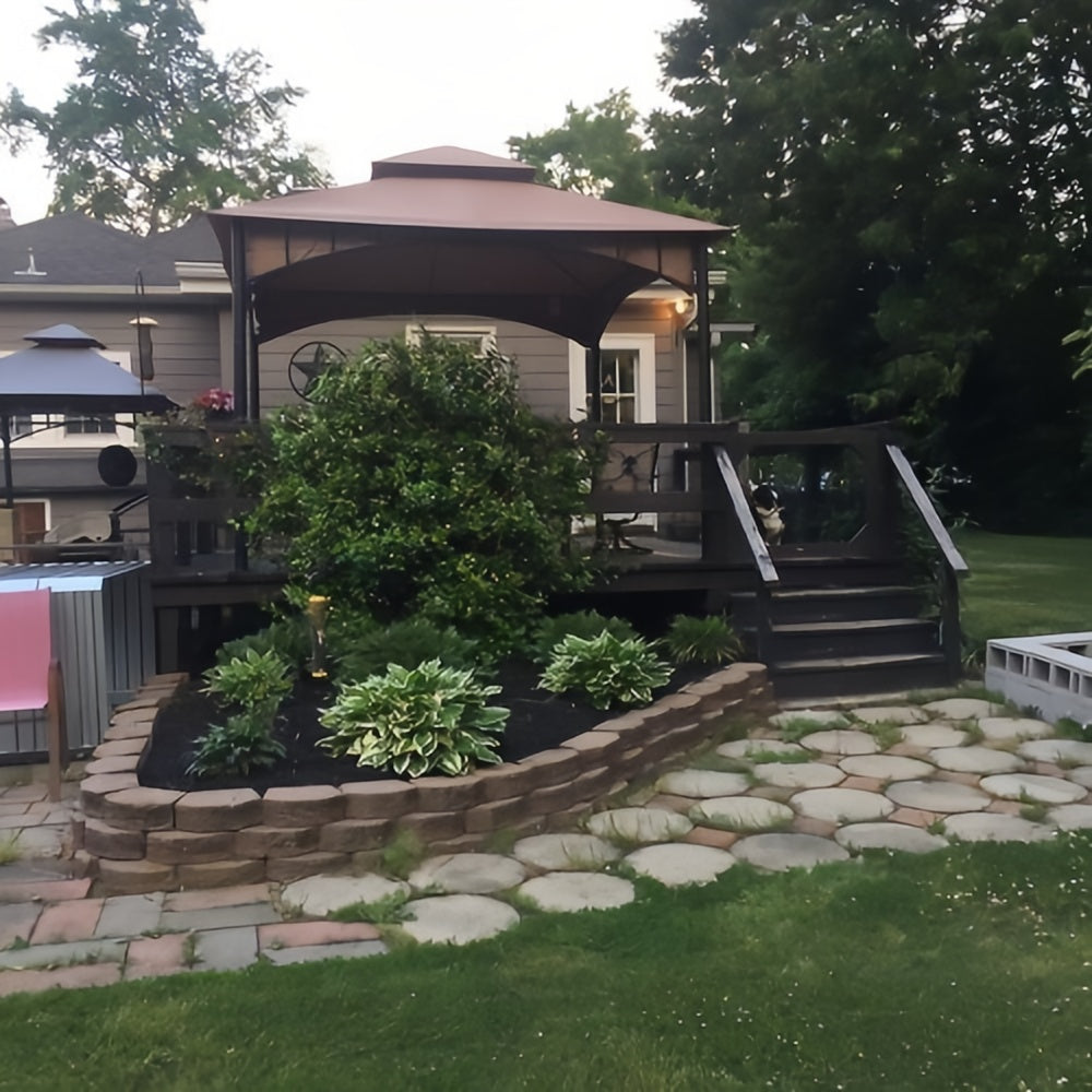 Gestalten Sie Ihr Wohnzimmer unter freiem Himmel und erschaffen Sie Ihre Oase im Grünen, an der Sie den Tag ausklingen lassen können. Der 340x340cm große Gazebo der Marke Sunjoy verhilft Ihnen dabei Ihren Rückzugsort zu schützen. Verweilen Sie sonnengeschützt unter dem zweistufigen, belüfteten Verdeck, dass von einem rostbeständigen Stahlrahmen getragen wird. Durch das Anbringen eines Kronleuchters an den eingearbeiteten Deckenhaken verleihen Sie Ihrem Gazebo den finalen Design Touch. Nutzen Sie das Netz um Mücken und Ungeziefer fernzuhalten. Mit der leicht verständlichen Aufbauanleitung werden Sie sich im Handumdrehen in Ihren neuen Lieblingswohnbereich im Freien entspannen.