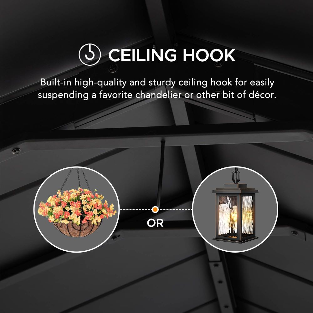 • Crochet de plafond intégré pour suspendre un luminaire (éclairage non inclus).