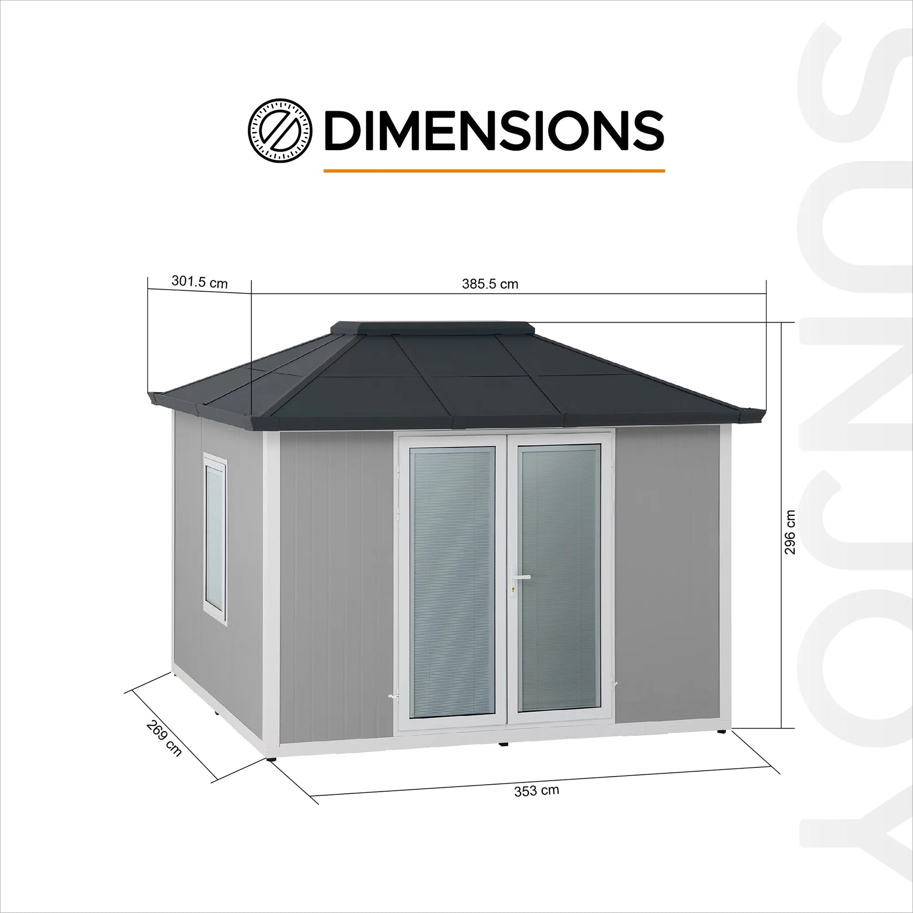 Bienvenue dans un monde d’élégance intemporelle et de qualité durable – votre refuge vous attend. Transformez votre jardin en un espace de possibilités illimitées avec le Garden House Riga by Sunjoy. Cet espace extérieur innovant et personnalisable a été conçu pour étendre l'espace fonctionnel de votre maison et de votre jardin. Que vous recherchiez une maison de jardin, un bureau en arrière-cour, un hangar, une salle de sport à domicile ou une salle polyvalente, avec le Garden House Riga vous êtes à la bonne adresse. Cette généreuse maison de jardin (386x302cm) a été conçue avec une grande attention aux détails et se distingue par une excellente artisanat et durabilité. Avec des murs, des portes, des fenêtres, des toits et des planchers isolés, vous vivrez le confort et la sécurité qui viennent avec une construction de haute qualité tout au long de l'année. Les panneaux muraux et fenêtres modulaires et interchangeables offrent une flexibilité maximale et une adaptation individuelle, tandis que le système de toit isolé de haute qualité.